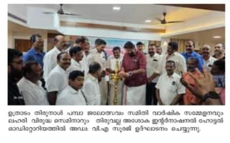 Environment conservation awareness seminar for school students conducted under the auspices of Uthratam Tirunal Pamba boat racefor the 66th K.C Mamman Mappila TrophyFormer Devaswom Board President Advocate K Anandagopan presidedPathanamthitta M.P Anto Anthony inaugurated the seminarWorking President Victor T Thomas, Punnuz Joseph, Municipal Councilor Sreenivas Purayat, Panchayat Member Jose Mamoodan, Rajasekharan Thalavadi, Neeta George etc. […]